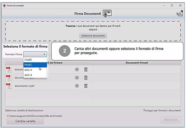 4) clicchiamo su prosegui e scegliamo dall'apposito menu a tendina lo standard di firma che intendiamo utilizzare, CAdES (.p7m) oppure PAdES (.pdf):