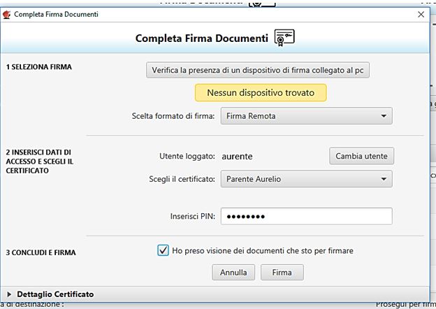 mentre se disponiamo di una firma remota scegliamo tale opzione nel box “Formato di firma” ed inseriamo le relative credenziali del certificato: