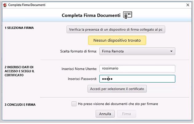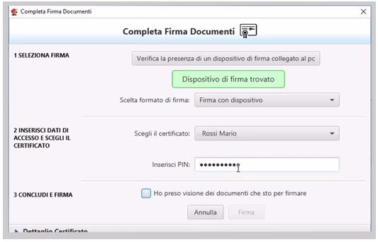 5) se utilizziamo un dispositivo di firma, inseriamolo e digitiamo le credenziali ad esso associate:
