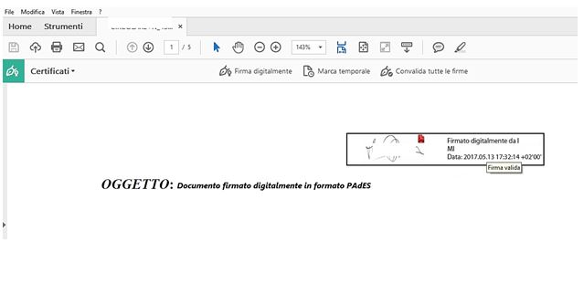 8) Potremo scegliere il timbro/firma che apparirà all'interno del documento cui la stiamo apponendo tra un formato standard di default oppure altro di nostra scelta (nell'esempio che segue abbiamo scelto la nostra vera firma autografa), e cliccando su “Firma” il documento firmato presenterà un file con la medesima estensione “.pdf” ed un testo nel quale è stato aggiunto il timbro/firma da noi prescelto, come segue: