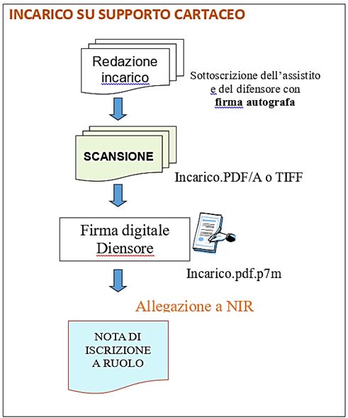 Quindi il difensore dovrà aver cura di fare sottoscrivere al cliente la procura predisposta sul supporto cartaceo e dovrà apporre anche la sua firma sul medesimo foglio, ai sensi di quanto stabilito dall'art. 12, comma 3, d.lgs. 31 dicembre 1992, n. 546; dopo la scansione del documento in formato .pdf o .tif (con le modlaità descritte all'art. 8 successivo) il solo difensore procederà alla firma digitale dell'incarico scansionato (in questo caso la firma digitale avrà valore di attestazione di conformità). Ricordiamo sempre che tale documento deve obbligatoriamente essere trasmesso unitamente all'atto per il quale viene conferito.