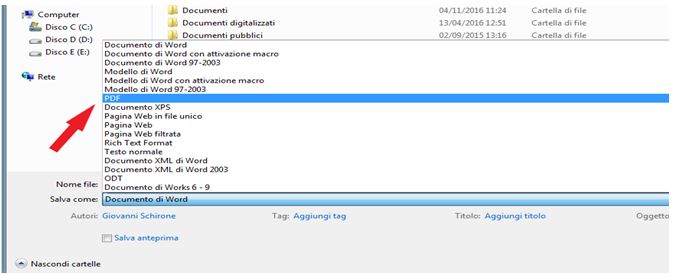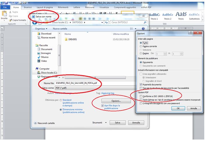 4) A questo punto cliccando su “OK” dell'ultimo riquadro e poi su “Salva”, in quello precedente, avremo generato il file in formato .pdf/A che ci occorreva, partendo da quello in formato word. Dopo la prima volta, la scelta della opzione “pdf/A” rimarrà memorizzata e, pertanto, per effettuare una nuova conversione basterà eseguire solo il salvataggio in “salva con nome” dopo aver scelto il formato .pdf.