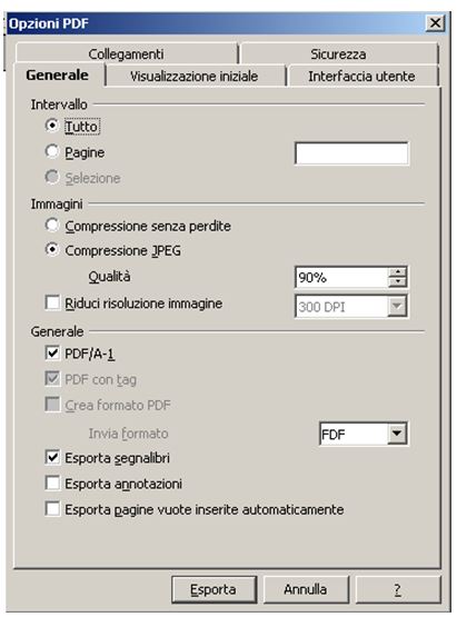 PIATTAFORMA OPEN OFFICE: Come generare un file in formato PDF/A tramite il comando “Esporta” Come prima, una volta compilato il testo del documento che ci interessa, dobbiamo procedere al suo salvataggio secondo questo processo: 1) Dal menu “File” cliccare sulla voce “Esporta nel formato Pdf” e cliccare sul pulsante “Opzioni PDF”. Si aprirà la seguente schermata, nella quale andremo a spuntare, sotto la voce “Generale” la casella “PDF/A-1”