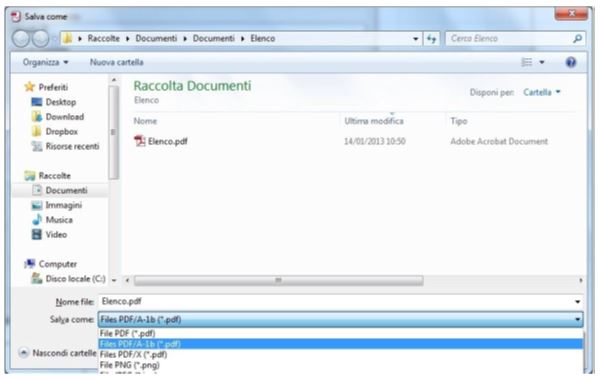3) Nella finestra indicare il nome da attribuire al file in “Nome file” (senza dimenticare di scegliere il percorso di directory e la cartella dove volete salvare il file) e selezionare in “Salva come” il formato “PDF/A-1b”. 4) Per concludere premere il pulsante “Salva” ed avremo generato il nostro file in formato .pdf/A.
