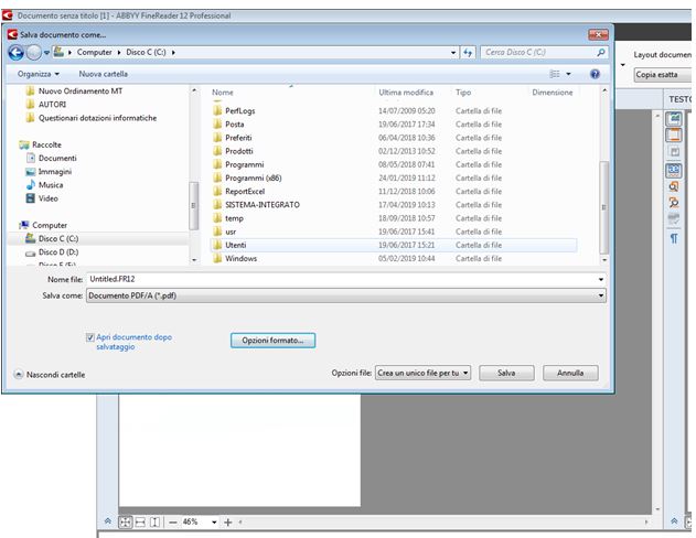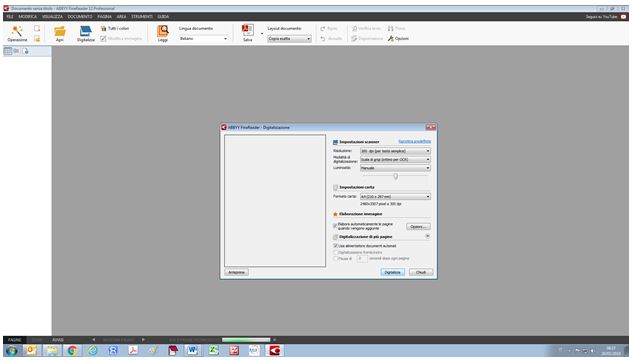 Per effettuare una scansione in PDF/A procediamo nell'esempio utilizzando il programma per la scansione documentale “ABBY FineReader v. 12”, ma la procedura è analoga per tutti i tipi di software utilizzabili per una scansione di un documento cartaceo.
