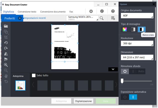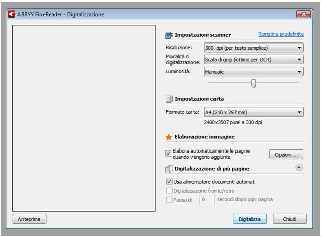 2) Per i migliori risultati impostare la “Risoluzione” al valore 300 dpi e la “Modalità di digitalizzazione” in “Scala di grigi”; dopodiché cliccare sul pulsante “Digitalizza”: