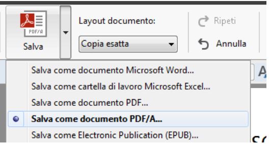 4) Clicchiamo sul triangolino nero a lato del pulsante “Salva” per far aprire il menù a tendina dove andremo a selezionare la voce “Salva come documento PDF/A” e poi clicchiamo sul pulsante “Salva”